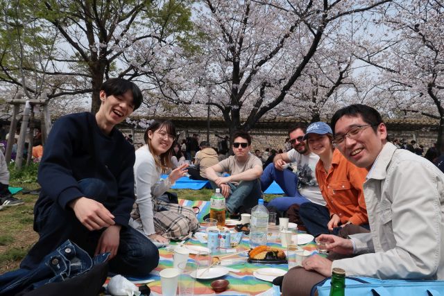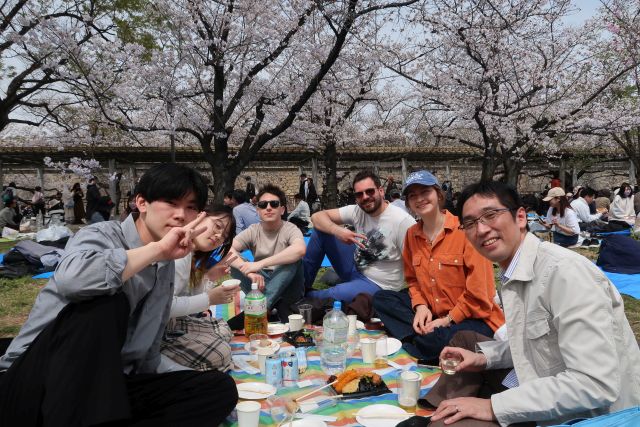 交換留学生を交えて大阪城公園で開催した花見の様子です。