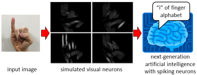 The purpose of this project is to develop a next-generation visual recognition system by combining artificial intelligence composed of spiking neurons and an algorithm inspired by cortical visual neuronal networks that respond to a particular shape and motion. This approach will lead us to achieve a small translation system of gesture, finger alphabet, and sign language.